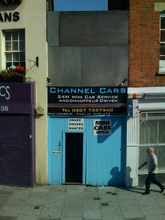 Near Stockwell Tube Station. I think the blue wooden facade flips down like a drawbridge whenever a taxi needs to get in or out.